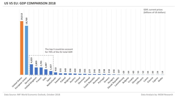 Data visualization : US vs EU – A GDP Comparison [OC]