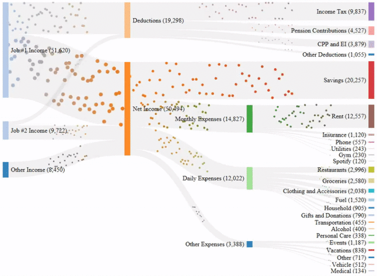 Data visualization : Watch my money flow! An animated representation of my 2018 income and expenses. [OC]