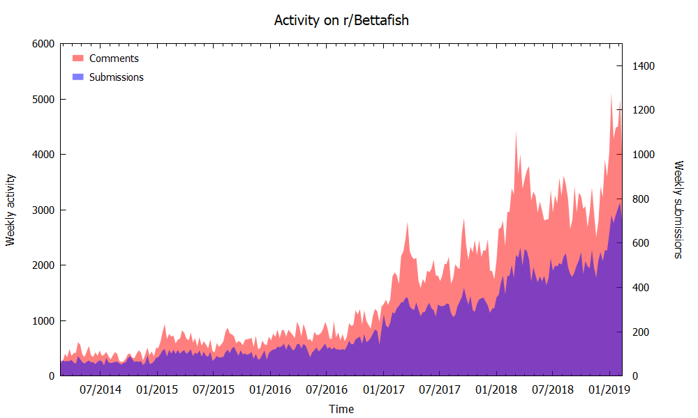 Weekly comment and submission activity on r/Bettafish over the last 5 years [OC]