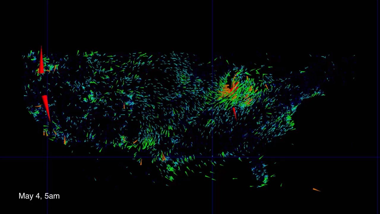 Data visualization : Wind Speed and Direction for Continental U.S., May 4 – June 1, 2018. [OC]