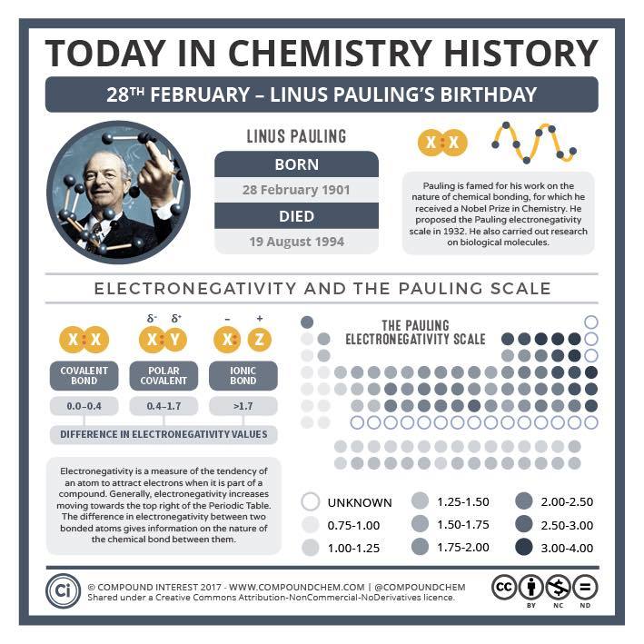 Linus Pauling was born #OTD in 1901. He’s famous for his work on the nature of chemical bonding and the widely used Pauling electronegativity scale: https://ift.tt/2PvsHoY https://ift.tt/3a5qmZY