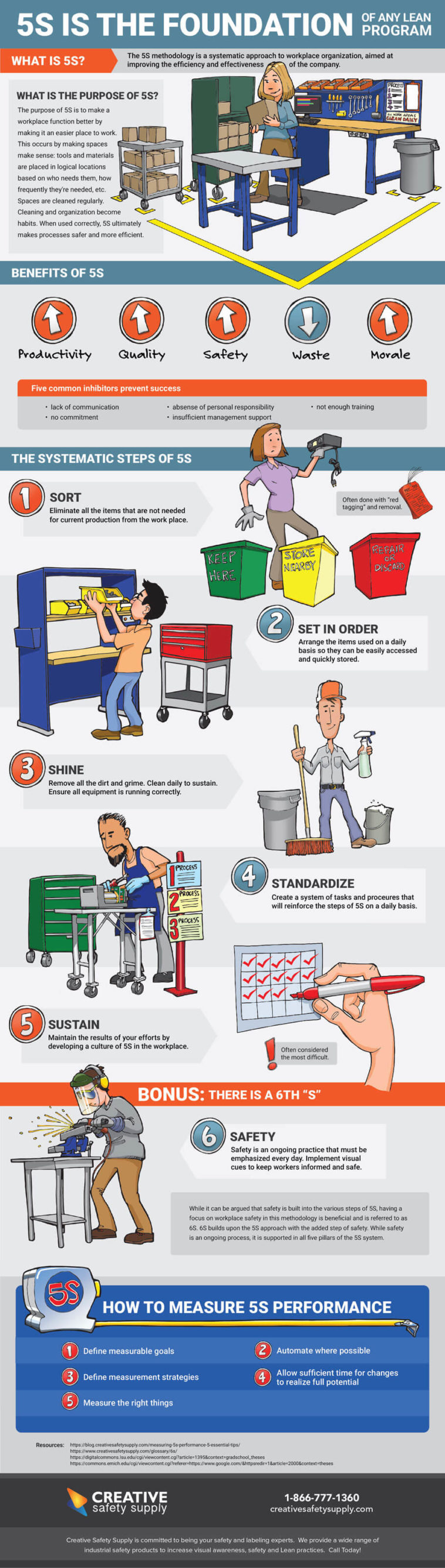 Organization is paramount to a safe and efficient workplace, but getting started can feel overwhelming. The 5S concept is a pathway to organization that has changed the way countless companies, large and small alike, run their operations. This infographic outlines what 5S does and how to implement it without headaches or hassles. Share this with colleagues or coworkers and start your 5S program today!