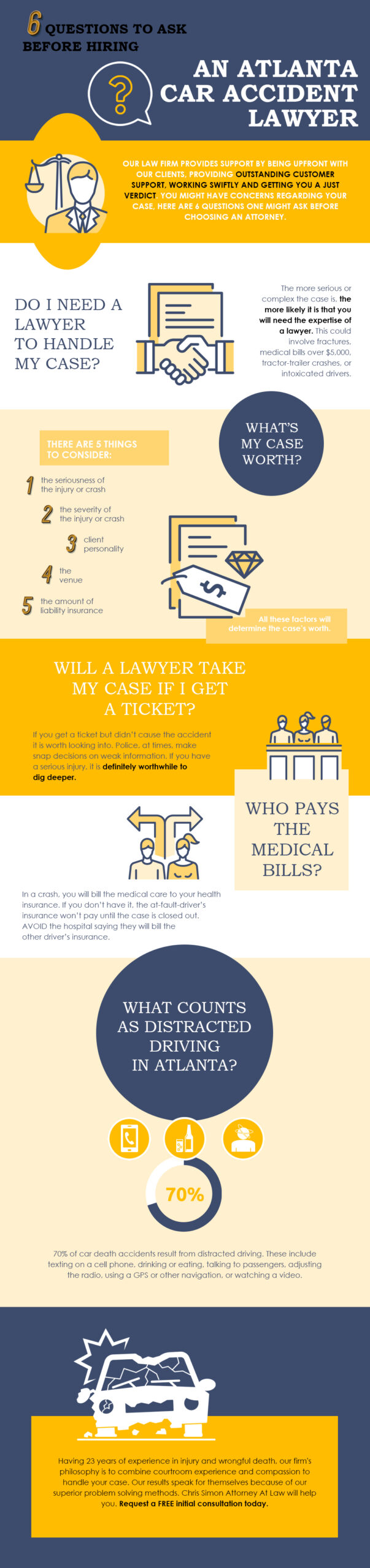 Our law firm provides support by being upfront with our clients, providing outstanding customer support, working swiftly and getting you a just verdict. An Atlanta Car Accident Lawyer at Christopher Simon Law has created an infographic to help you ask questions before solidifying that an attorney is the right one for you.