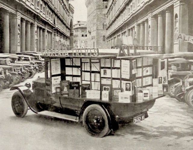 A book wagon founded by Emilio Treves for his publishing house. On the photo, you see the van on its inaugural tour in Florence, 1922 More