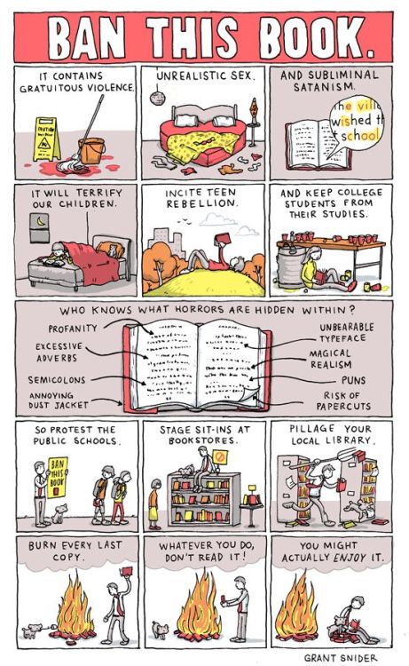 A great cartoon by Grant Snider is the perfect description of what book challenging is about