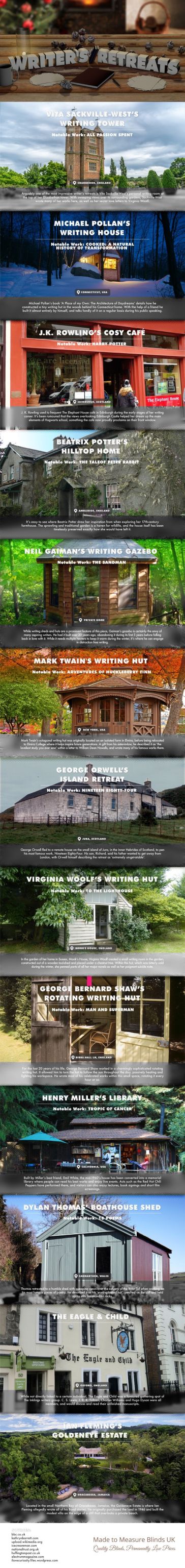 A nice infographic that looks into writing retreats of thirteen famous authors, including J.K. Rowling, Mark Twain, and Virginia Woolf More