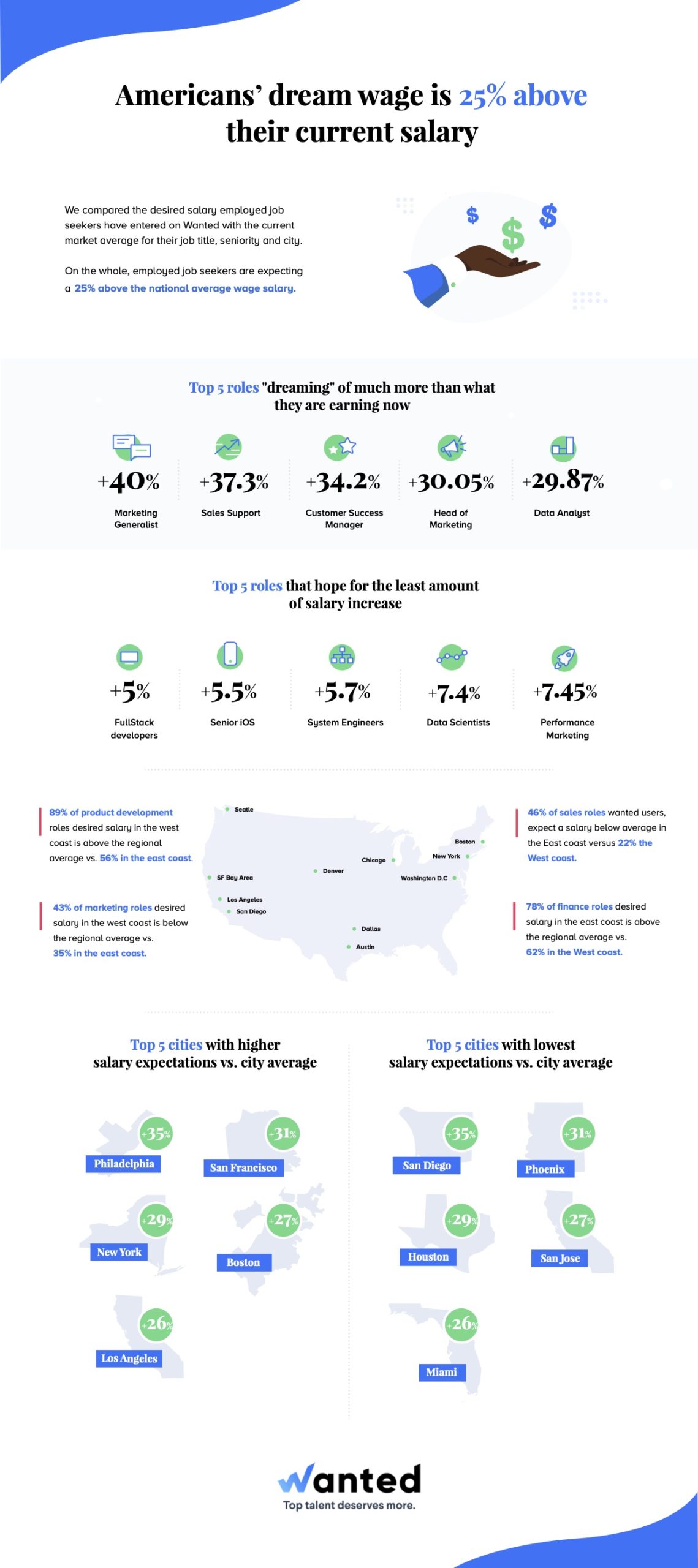 As a result of our study where we compared the desired salary employed job seekers have entered on Wanted with the current market averages of their job titles, seniority and city, Americans expect a salary that is about 25% above their current compensation. It’s definitely not the only factor that matters, but salary is a key ingredient to motivate and engage employees!