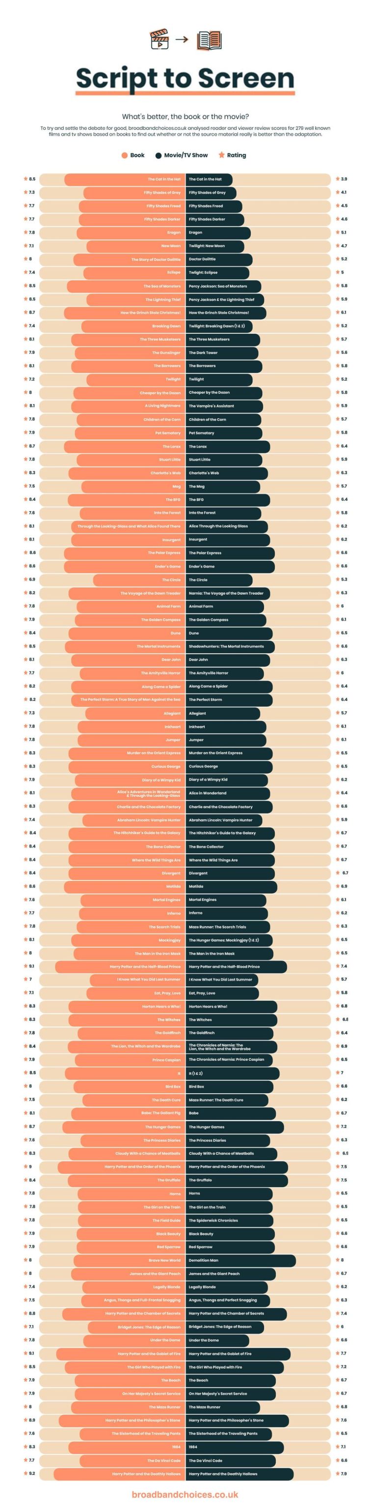 Based on ratings from Goodreads and IMDB, 83.5% of books are better than their movie or TV show adaptations More