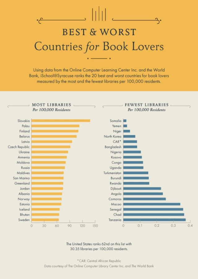 Best and worst countries for book lovers, based on the number of libraries per 100,000 residents | đź”– #infographic #libraries #librarylove More