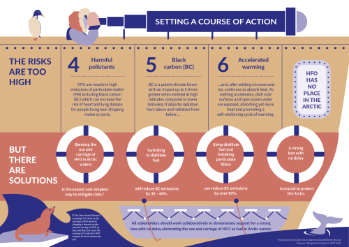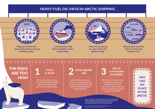 Heavy fuel oil (HFO) is shipping’s dirtiest fuel – almost impossible to clean up following a spill, and produces high levels of pollution when used by ships. The Arctic is warming at twice the global average. Between 2015 and 2019, HFO use in the Arctic increased 75%. This infographic demonstrates how HFO has no place in the Arctic. This infographic was realised for the Clean Arctic Alliance.