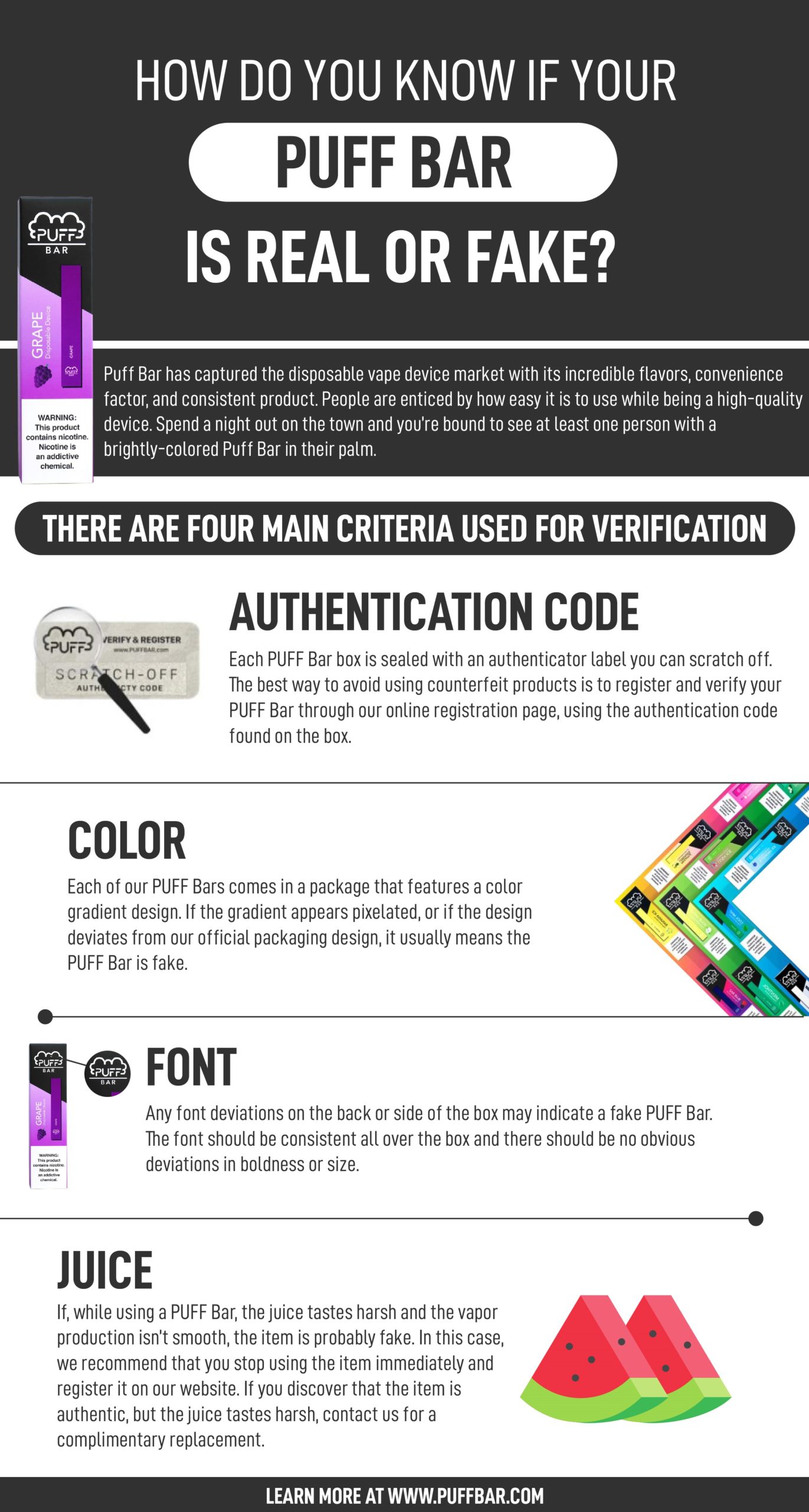With so many counterfeits, how do you know if your Puff Bar is real or fake? Well, besides buying directly from the source at Puffbar.com, you need to check the Authentication Code, Color, Font and Juice. Counterfeit and clone production companies do their best to create identical models of the products they copy. Some are able to get close to the mark, but if you know what to look for you can always tell the difference.