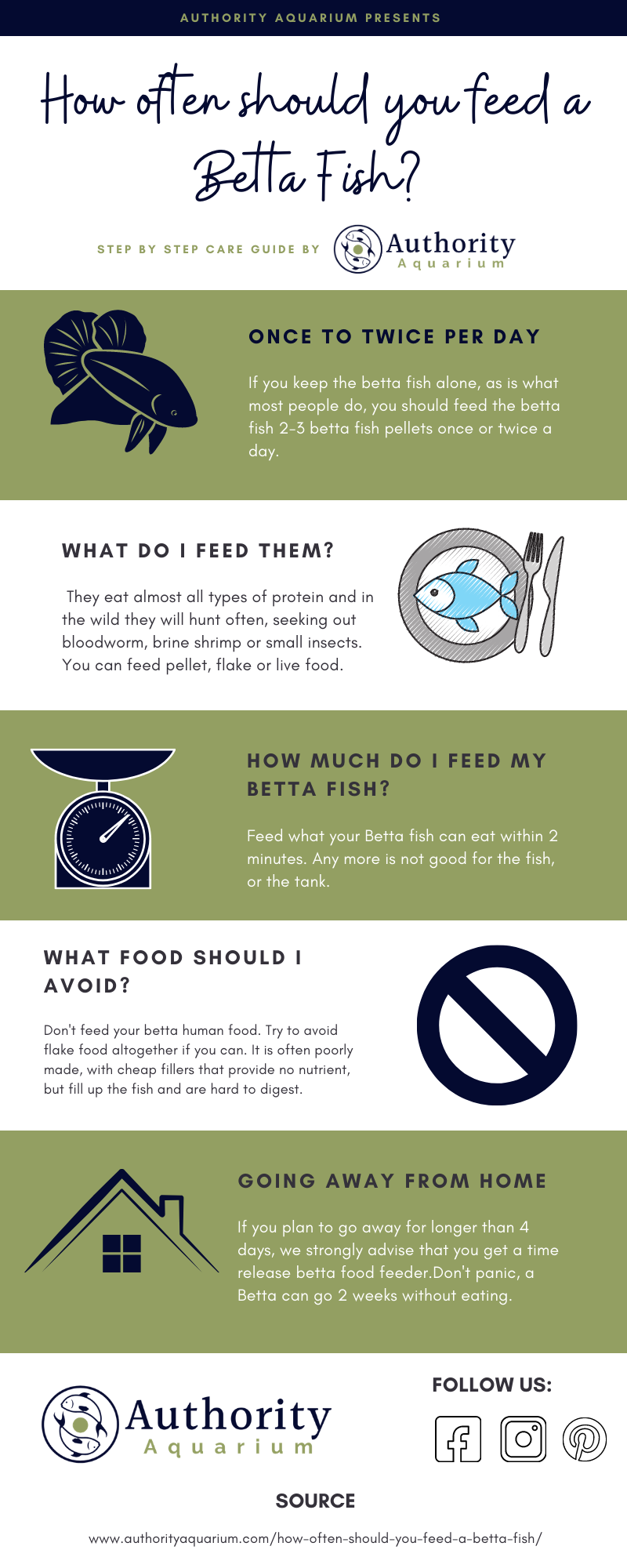 This infographic by Authority Aquarium breaks down simply how much food and how often you should be feeding your betta fish (siamese fighting fish), to keep it in the best health possible.