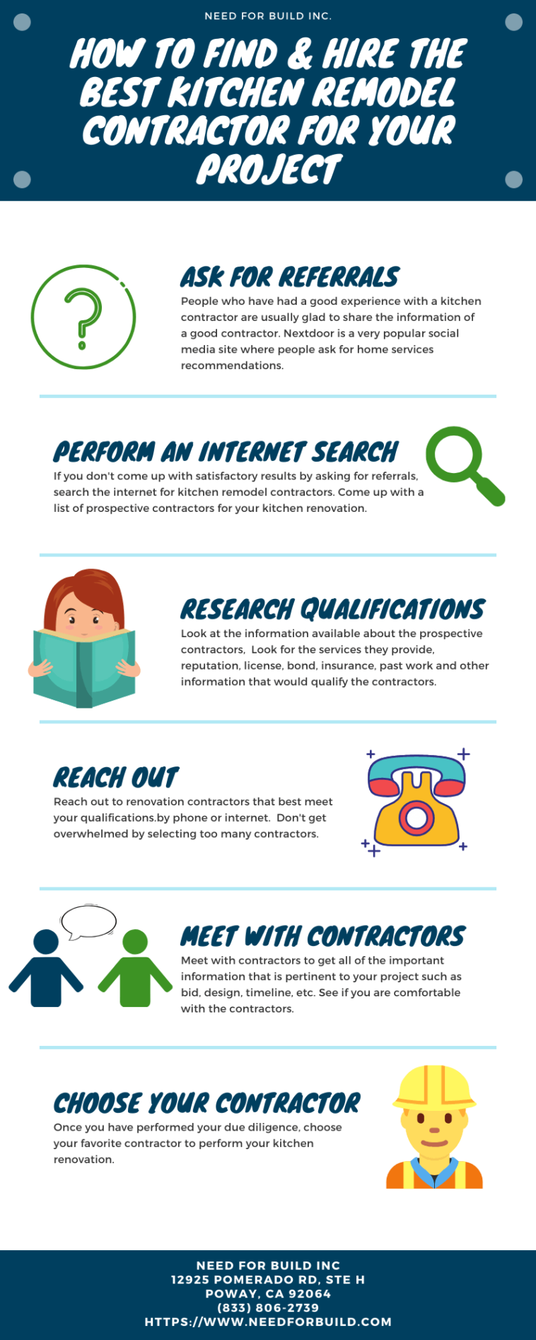Oftentimes a homeowner doesn’t know the best way to find and hire the best kitchen remodel contractor for their project. Research that answers the right questions will help them discover whether a kitchen remodeler is right for their project. This infographic outlines an effective process for finding and hiring the best kitchen contractor for a project.