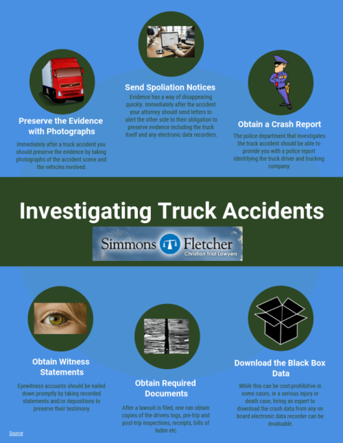 Truck accidents more complex than a simple car wreck. The truck accident attorneys at Simmons and Fletcher, P.C. offer this basic infographic on investigating truck accidents to demonstrate important steps in the investigation.