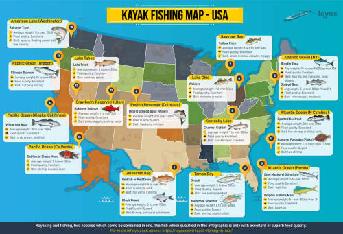 This is a map of the most delicious fish available in the USA. Presenting you the location and what bait to use so you can cacth it. You can do it while paddling in a kayak. Think about kayaking and fishing, two great hobbies combined in one. At the end a perfect meal and stories to share with your family and friends. Gear up!