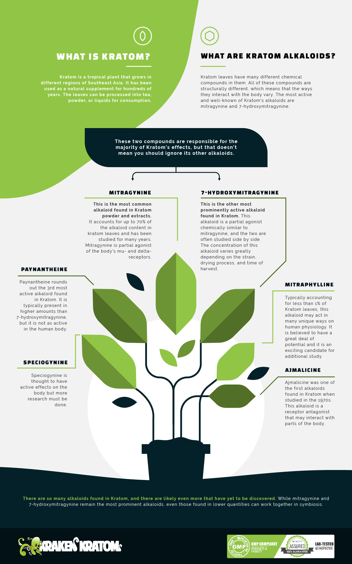 Kratom contains many complex alkaloids which are responsible for how it interacts with the body. This infographic helps breakdown the most common alkaloids found in Kratom.