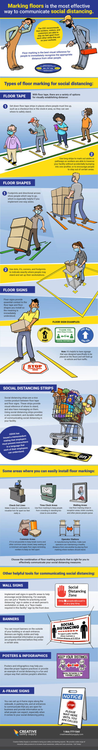 Protect customers, visitors, and workers by visually communicating social distancing! According to the CDC, the best way to stop the spread of virus is by keeping a distance of six feet from one another. Floor marking is a simple + cost effective way to promote healthy habits in your workplace. This infographic from Creative Safety Supply explores how to best use floor marking to enforce social distancing.