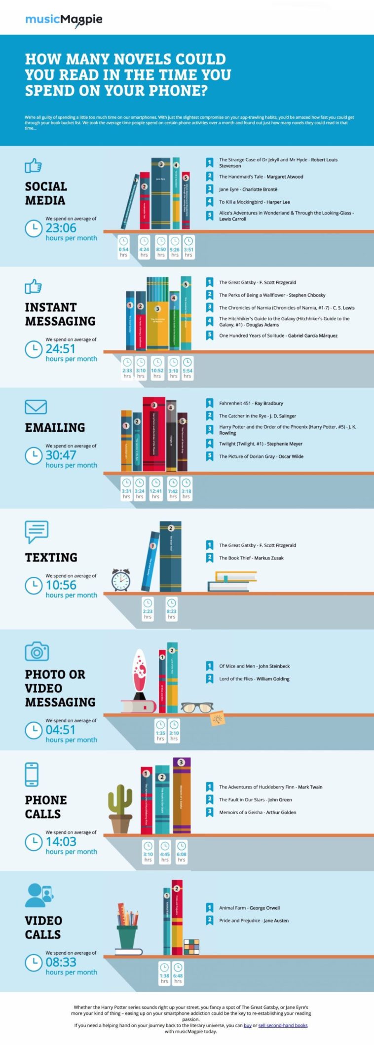 On average, the monthly time spent on phone activities reaches 120 hours. If you stopped using your phone completely, you’d read 24 #books! More