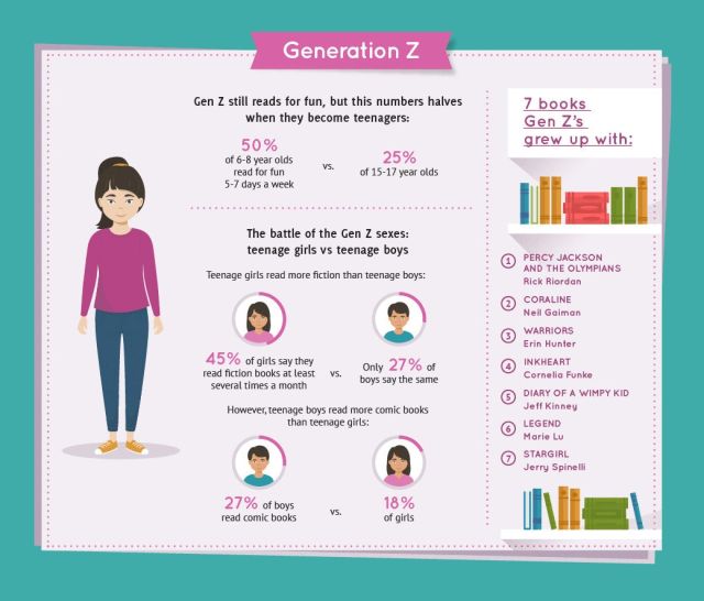 Reading habits: Generation Z (aged 5-25) – teenage girls read more fiction than boys, who prefer comic books. 50% of 6-8 year olds read for fun 5-7 days a week More