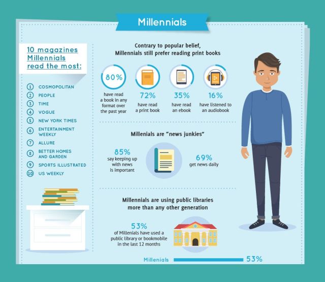 Reading habits: Millennials (aged 26-40) prefer reading print books (72%) over ebooks (35%). They are using public libraries more than any other generation More