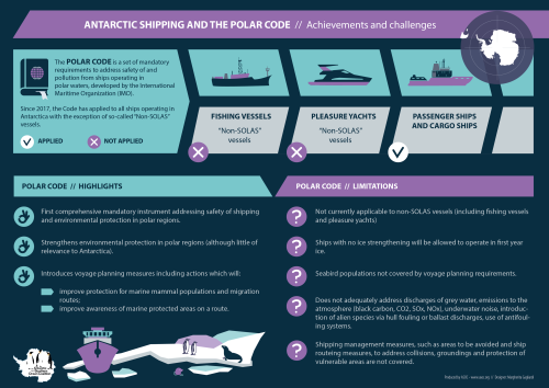 The Polar Code regulates shipping in the polar regions to keep people and the environment safe. This #infographic highlights the achievement of the Code, as well as its limitations. It was realised for the Antarctic and Southern Ocean Coalition (ASOC) is part of a campaign that calls on the International Maritime Organisation to fill gaps in the Code.