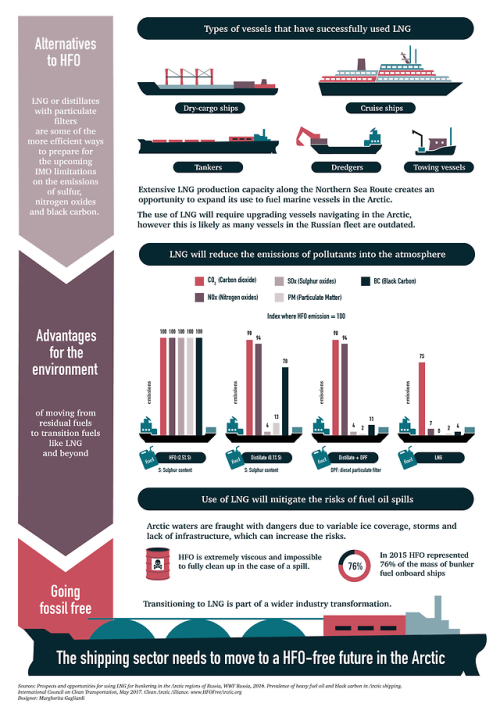 This infographic, released for the Clean Arctic Alliance in 2017, demonstrates that switching to clean fuel for shipping in the Arctic is possible. Alternative fuels and technologies are already available and can reduce emissions and the risk of oil spills.