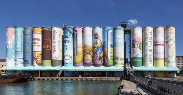This mural in the Incheon port, South Korea, turned the gloomy grain silo into a giant bookshelf. Look at this beauty! More