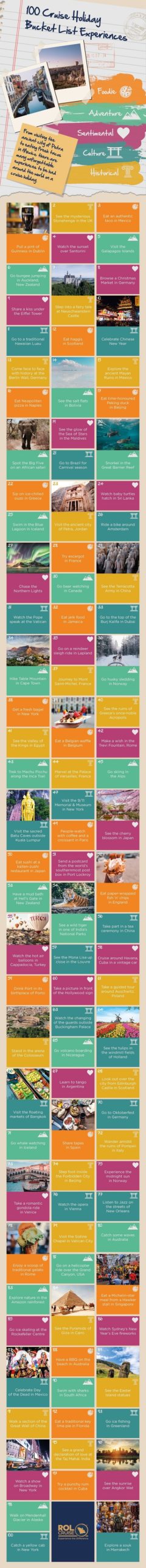 Recently, the UK’s number one cruise specialist ROL Cruise created their ultimate cruisers bucket list, detailing 100 experiences that they believe every traveller should try and tick off in their lifetime. The list is split into five categories, Foodie, Sentimental, Historical, Cultural and Adventure, so there is something for everyone. The infographic displays all 100 of these experiences, showing just how much amazing stuff there is to do around the world. In the accompanying article, The ultimate cruise holiday bucket list, they talk to travellers about some of these experiences and discover why they are truly unmissable.