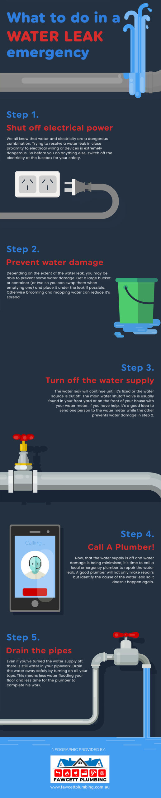 This infographic by Fawcett Plumbing in Adelaide covers what you can do to minimize damage caused by a water leak emergency