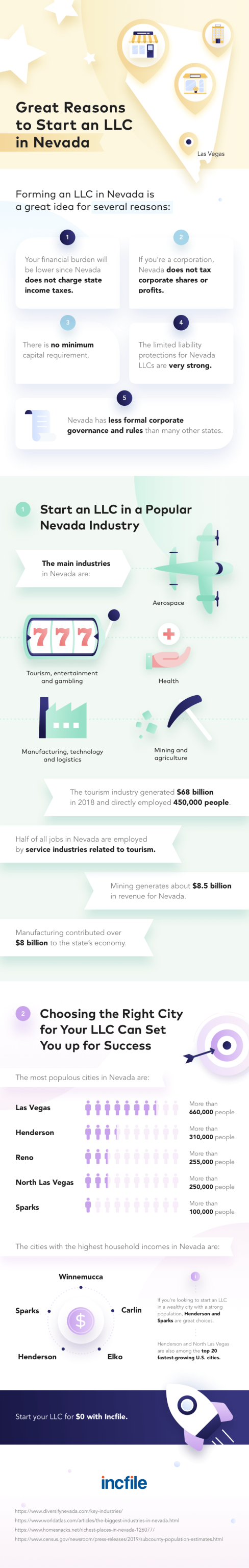 Some include no state income, no corporate or franchise taxes, no taxes on corporate shares or profits, privacy protection for owners choosing to be anonymous, and low business registration fees and quick turnarounds. These are just a few benefits, but there are so many! Use our infographic to weigh the pros and cons of starting a business in Nevada. We also detailed the best cities to start your business and industries that are booming in the state of Nevada.