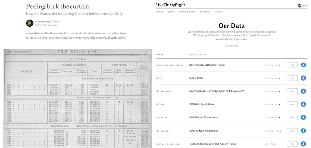 In what could prove to be a growing trend in 2019, The Economist and FiveThirtyEight launched new repositories for publishing releases of the data behind their work. As Evan Hensleigh explains “…releasing data can give our readers extra confidence in our work, and allows researchers and other journalists to check — and to build upon — our work”. Furthermore, where appropriate, both are intending to release the associated analysis and code behind each data-driven article/graphics projects.