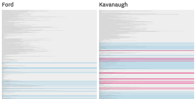 A typically astute piece by one of my favourite visualisers, Alvin Chang, where he creates a visual transcription of the Senate testimony of Supreme Court nominee Brett Kavanaugh and the woman accusing him of sexual assault, Christine Blasey Ford. This visual plots the occasions where Ford and Kavanaugh answered the questions put to them as well as the occasions when they did not. The result is striking and it was compelling to witness the ripple effect of this piece being cascaded across social media.