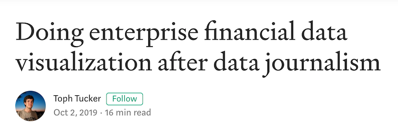 Continuing the theme of writing about data visualisation, this was one of the most insightful articles I read all year, written by Toph Tucker. As the title alludes, this is a collection of observations contrasting Toph’s experiences in his new role doing enterprise financial data visualization after moving from a career in data journalism. He expertly dissects the hidden cultural and contextual constraints that affect how he goes about his work now compared to his previous role, across a range of headings such as ‘the people’, ‘the market’, ‘the incumbents’, ‘the normal forms’, and ‘the limits of the craft’. Very much worth 16 minutes of your time.