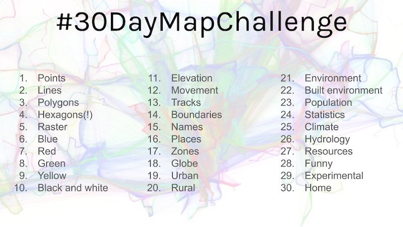 The #30DayMapChallenge was a wonderful idea from Topi Tjukanov taking the form of an open challenge for people to create ‘a map a day for each day of November’. The rules were simple: no restriction on tools, but all maps should be originals created by each participant. As the image above shows, each day had a different creative theme or restriction and the results were amazing, as collected by Dave Friggens. Look out for the 2020 edition coming up again later this year.