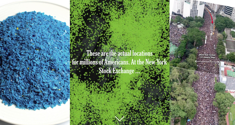 One of the enduring challenges in visualisation is effectively representing large values in ways that capture the sheer scale of phenomena. In the last few months of 2019, we saw several pieces from Reuters and the New York Times that demonstrate brilliant techniques for achieving this. From Reuters, the Drowning in Plastic and A Plateful of Plastic works focused on representing huge quantities concerning the topic of plastic waste. The Times did a superb deep investigation into mobile phone surveillance in ‘Twelve Million Phones, One Dataset, Zero Privacy’ as part of the ‘Privacy Project’. Additionally, both Reuters and the Times employed particularly novel methods for quantifying and displaying analysis about the crowd sizes during the Hong Kong protests.
