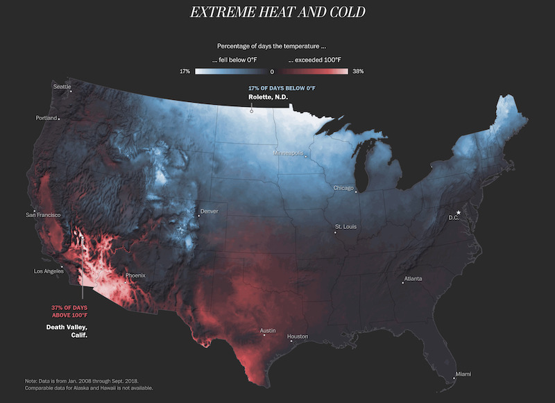 Tim Meko is Deputy Graphics Editor at the Washington Post and is one of the most talented and experienced visualisers as well as being, in particular, amongst the finest cartographers on the scene. The map shown above is one of several distinct thematic techniques published in an article ‘Mapping America’s wicked weather and deadly disasters’ which is an outstanding exhibition of his skills. Check out his wider portfolio at the Washington Post for relentless inspiration.