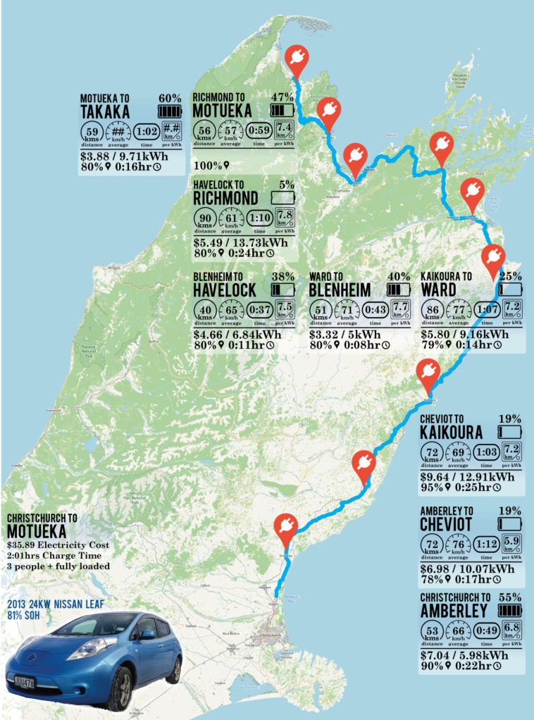 Infographic : 546 mile / 944km electric vehicle road trip in New Zealand