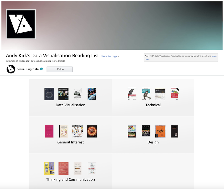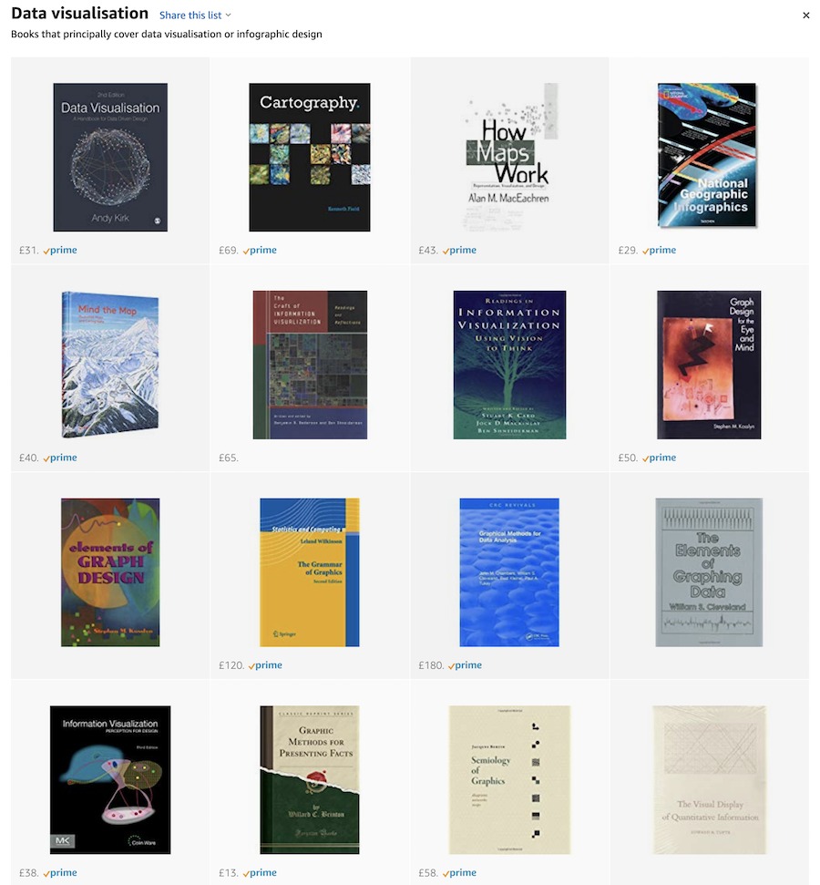 I often get asked to recommend books about data visualisation and in the past I had a dedicated page on here with a long list of books I have personally found influential or inspirational. This list had referral links to the Amazon sales page in each case but it was really buggy and kept slowing down when attempting to load hundreds of book thumbnail images.