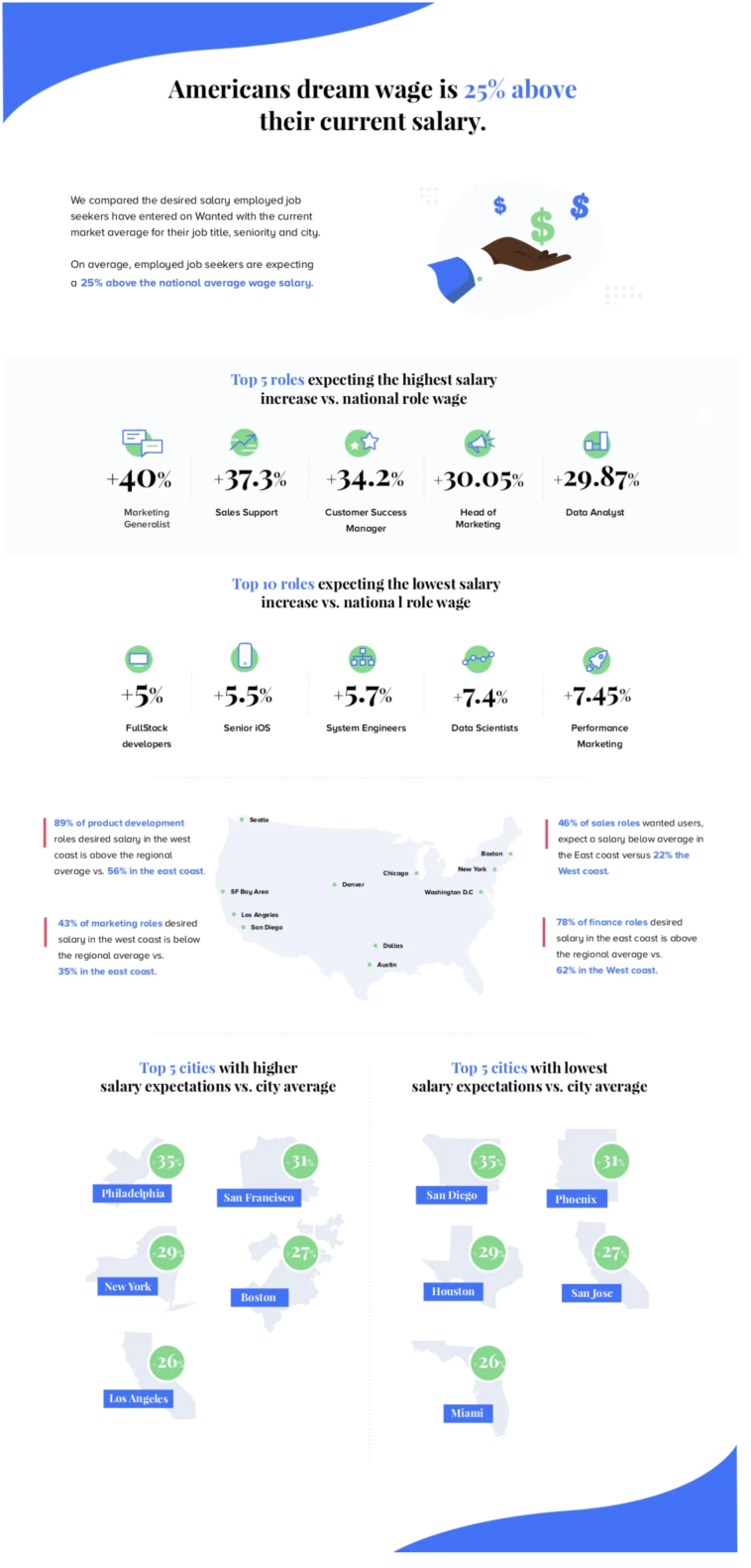 The ‘Americans’ dream wage is 25% above their current salary’ infographic is the result of a unique survey conducted by Get Wanted. An interesting insight into the mindset of employees across the US.