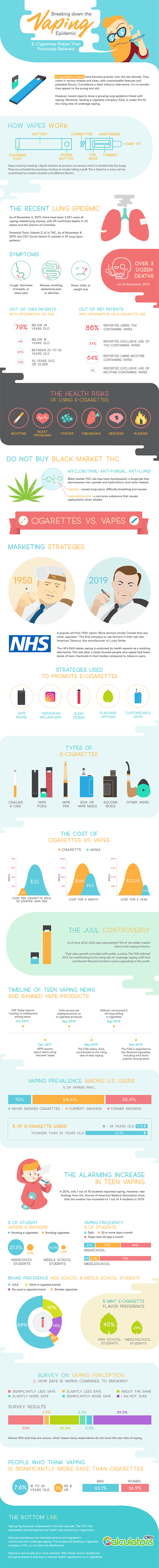 Analyzing the health risks of vaping from calculators.org comprehensively tackles the vaping epidemic and offers a lengthy graphic full of stats and information.