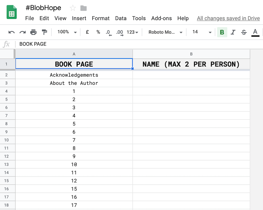 To enter, just visit the Google Sheet listing all my book pages (that aren’t blank, I didn’t want to be cruel) and put your name against a maximum of two page numbers that you think might have the word ‘blob’ on them.