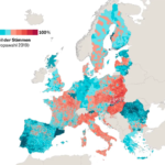 Map : Share of votes in favor of a more restrictive immigration policy – Proportion of votes for parties who, according to the CHES experts, have a slightly to severely restrictive stance on immigration [Zeit.de]