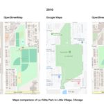 Map : Comparison of Google Maps (left) versus OpenStreetMap (right) of a new park that had opened in Little Village, Chicago 2016