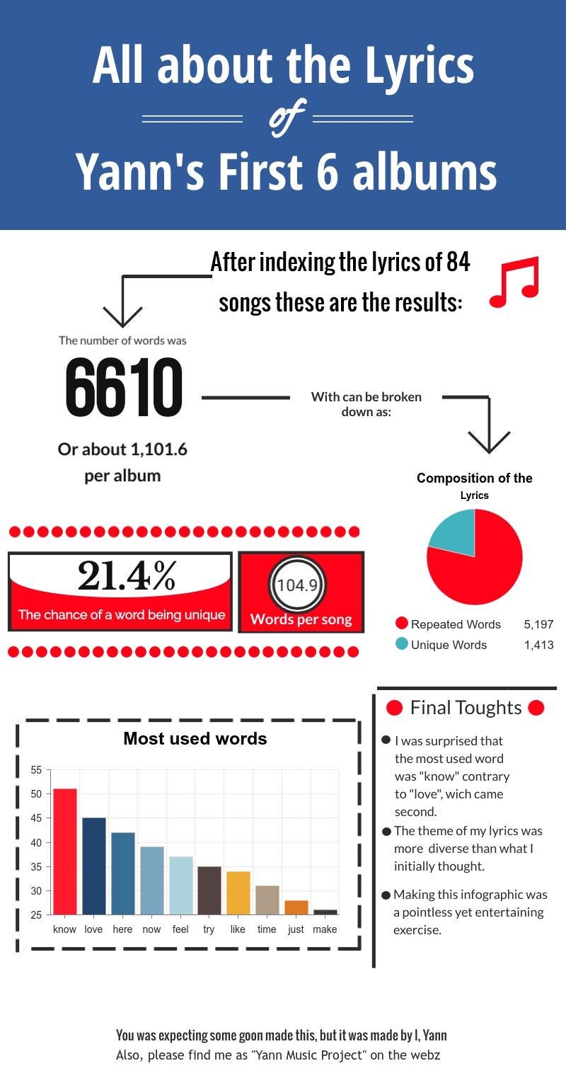 Infographic : [OC] A quick infographic about the data related to the lyrics of my first six albums. Enjoy!