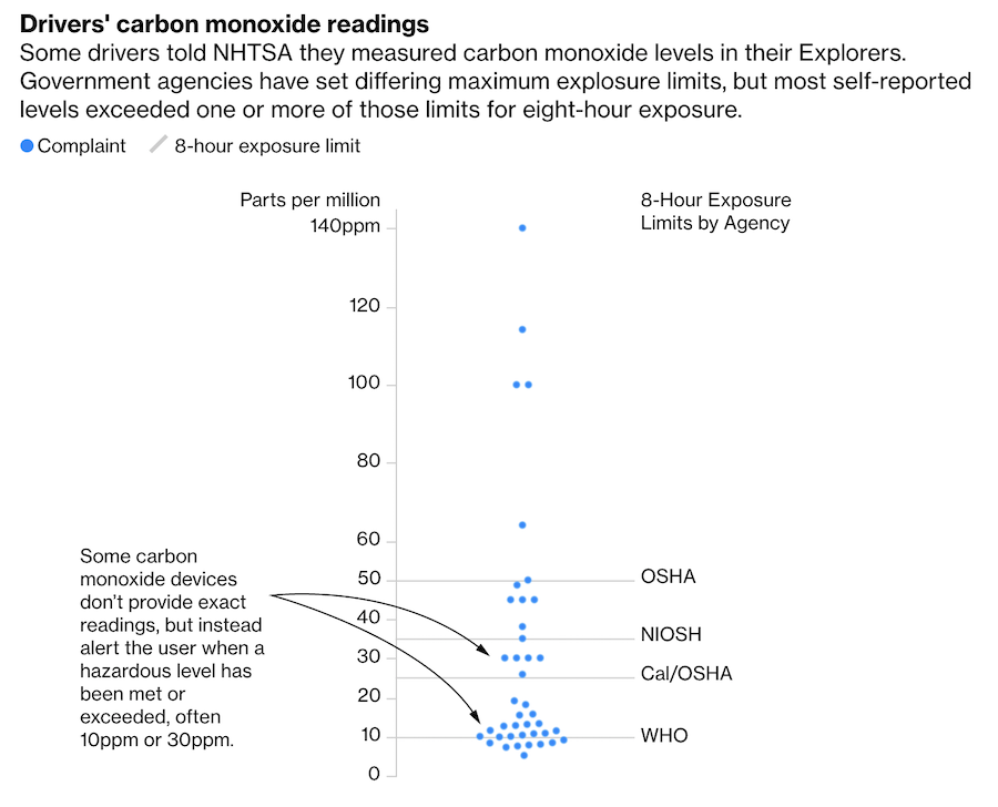 The ‘little’ of this next design concerns the use irregular axis scales. The piece of work in focus was produced by Allison McCartney of Bloomberg in an article titled ‘Ford Explorer Owners Say Their SUVs Are Making Them Sick‘.