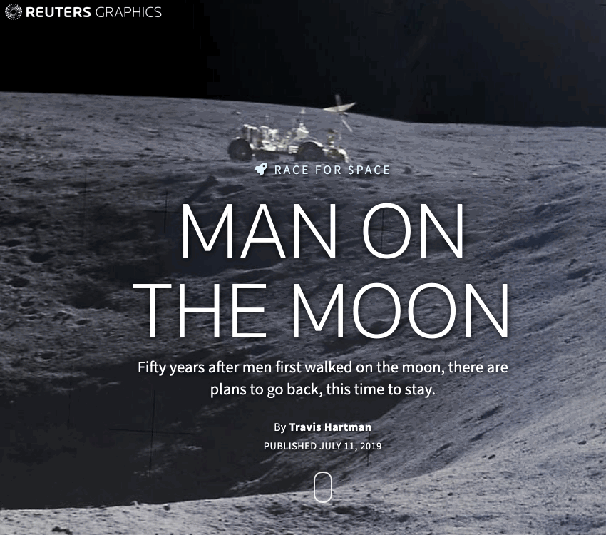 The ‘little’ of this next design concerns the clever offering of user-interaction prompts. The work in focus was produced by Travis Hartman for Reuters titled ‘Man on the Moon’.