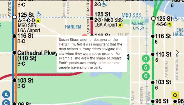 The ‘little’ of this next design concerns a smart animated transition effect used in a project produced by Antonio de Luca and Sasha Portis published on the New York Times’ and titled ‘New York’s Subway Map Like You’ve Never Seen It Before’. The work is a really nice navigable collection of visual anecdotes about the social and political background that shaped the design of the NYC subway map. Many thanks to Jon Schwabish for alerting me to a particularly nice subtle design feature.