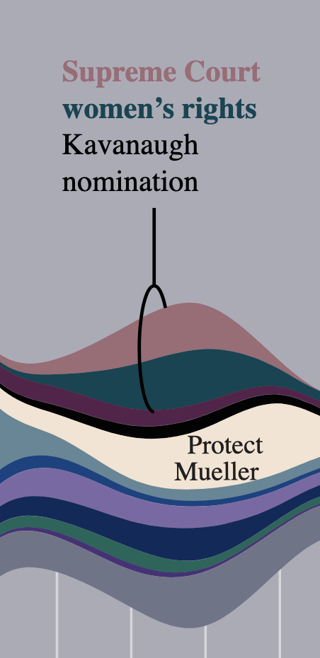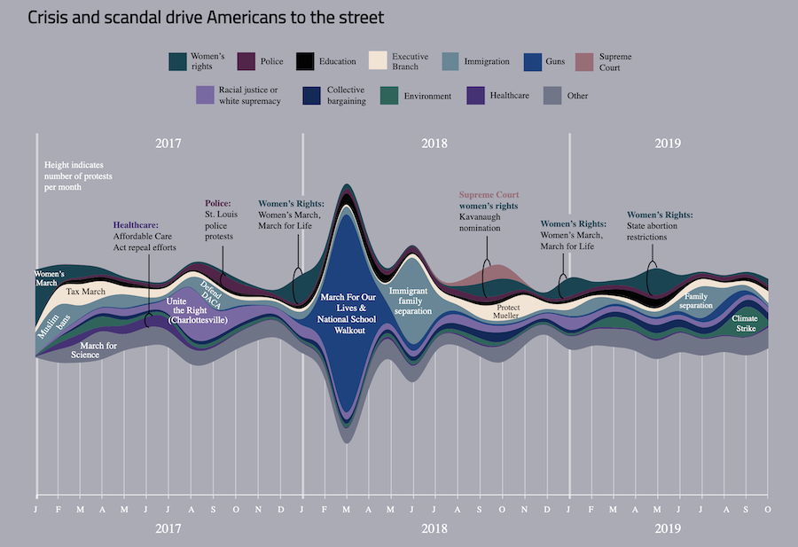 The ‘little’ of this next design concerns a neat way to design a label pointer from this work by Alyssa Flowers titled ‘Points of Light: Protest in America’ which explores patterns around the more-than twenty thousand protests that have been held in America since the inauguration of Trump.