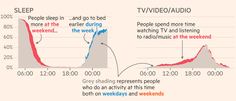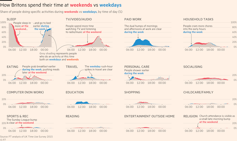 The ‘little’ of this next design concerns using colours to editorially emphasise the most important features of a chart’s display. The work in question comes from John Burn-Murdoch in a Financial Times article titled ‘The truth about weekend working’. The visualisation is comprised of small-multiple area charts, showing the patterns of how people spend their time across different activity categories over a 24 hour period.