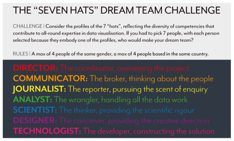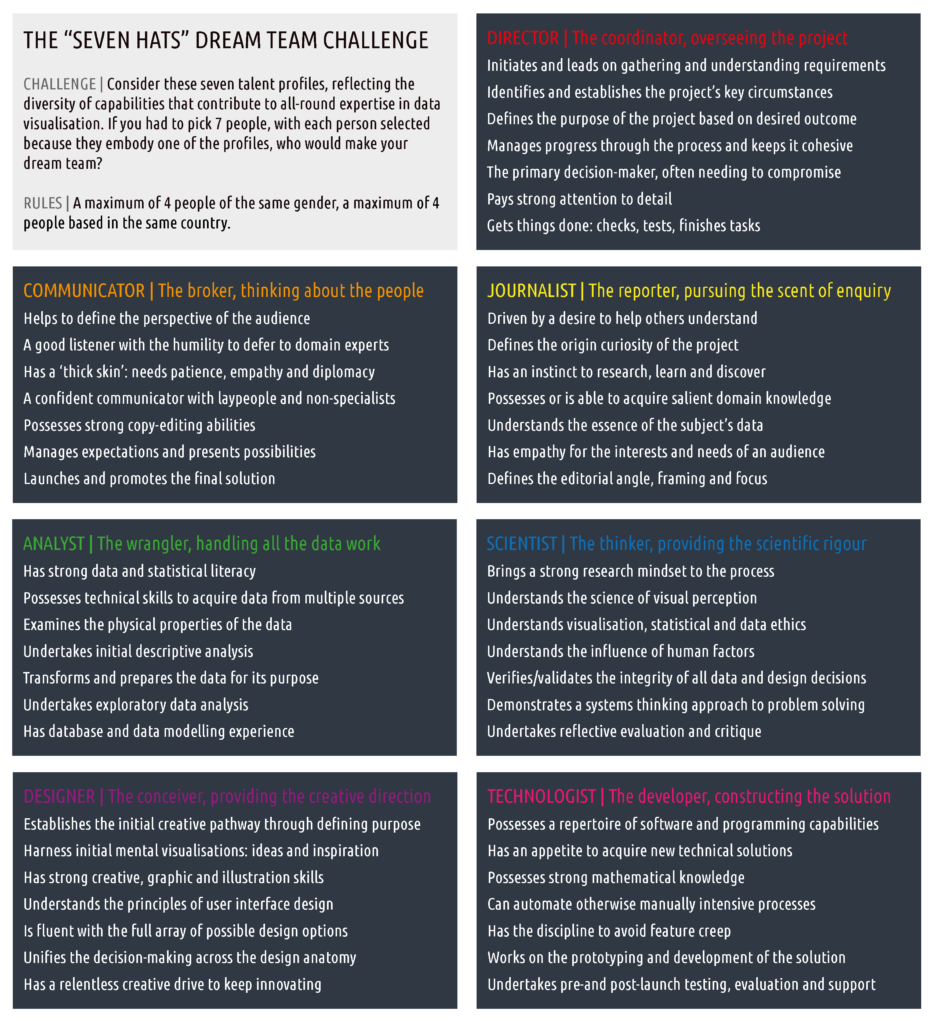 And so, based on my ‘Seven Hats of Visualisation Design’ concept, which considers the ideal profile of skills, knowledge, attitudes, and attributes that make up the perfect all-round visualisation capability, I have been thinking about the idea of the ‘”Seven Hats” Dream Team Challenge’.